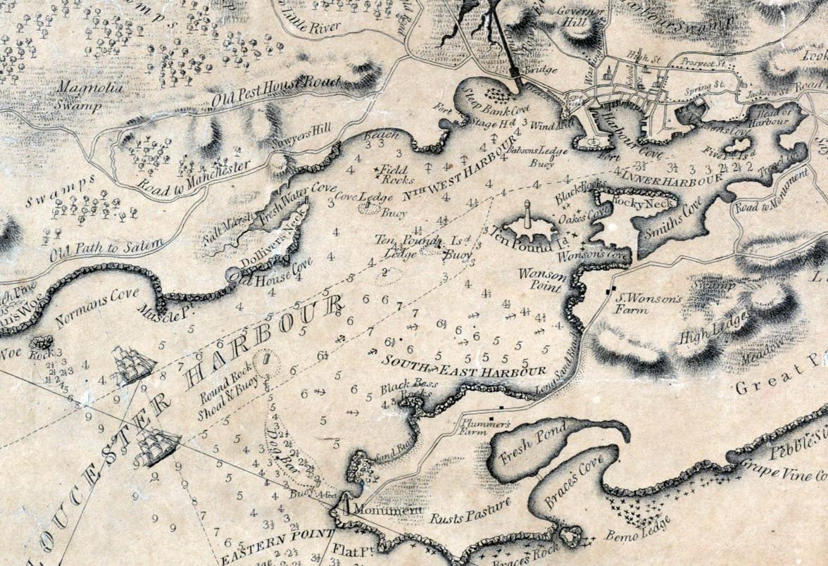 Detail of “Gloucester Harbour” from “Map of Gloucester, Cape Ann” from survey by John Mason, printed by Senefelder Lithographic Co., Boston, in 1831, available at the Library of Congress and the Leventhal Map Center at Boston Public Library.