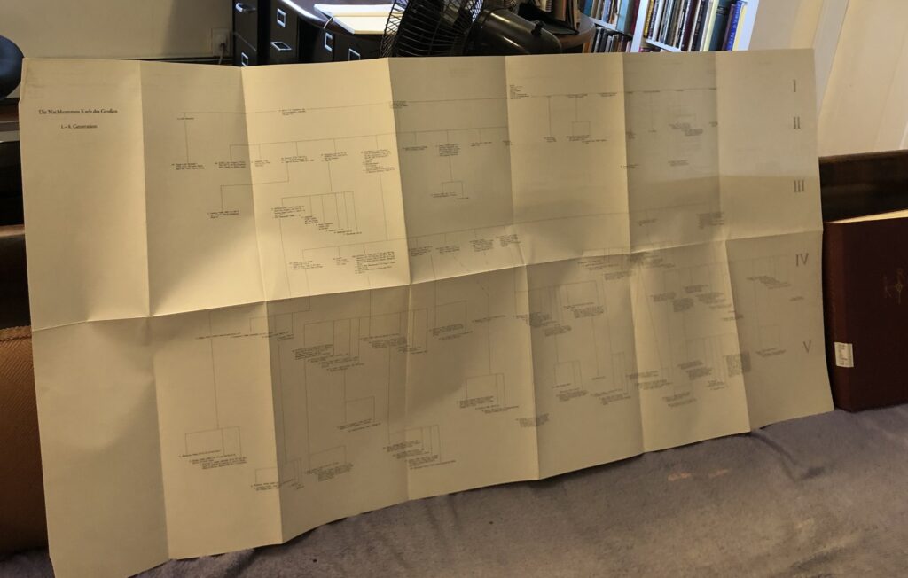 Recent addition to a Charlemagne bookshelf: huge pedigree of all known descendants of Charlemagne through eight generations, roughly to the year 1000. This side, generations 1-5; other side, generations 6-8, so you need two copies if you want to display it!
